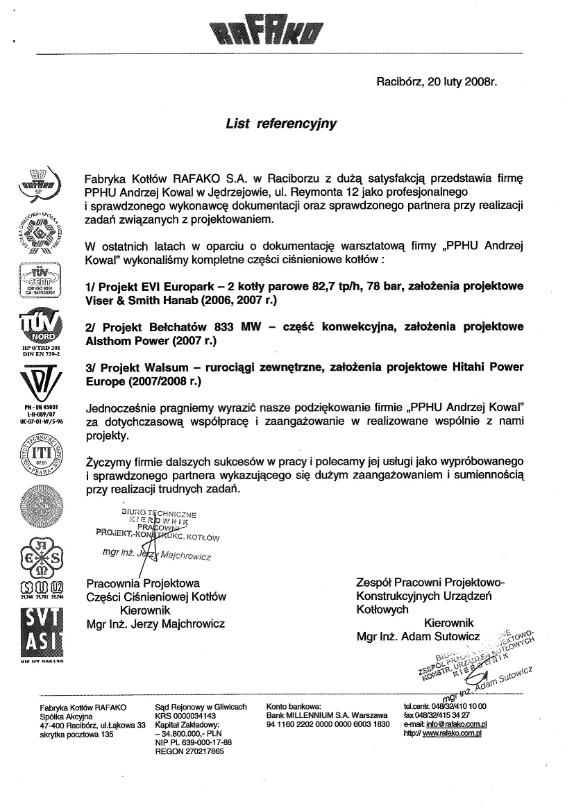 with leading companies producing boilers such as SEFAKO and RAFAKO allows for the exchange of professional experiences, and implementation of major project tasks. The motto of the company is reliability and deadlines keeping.